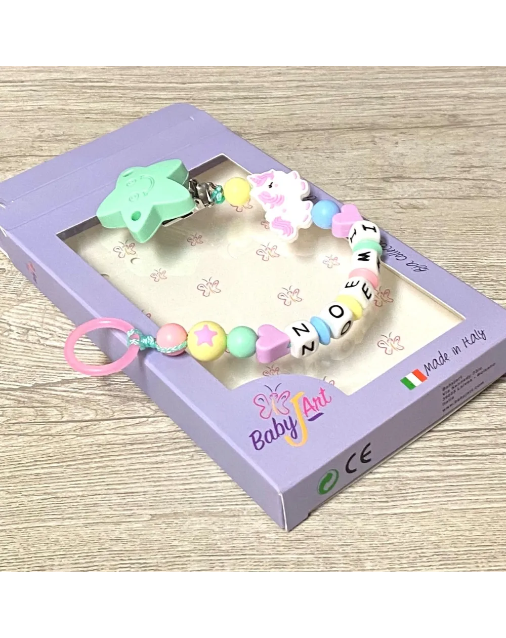 Alle Komponenten werden nach höchsten Sicherheitsstandards und gemäß EN 71-3 hergestellt: - Die verwendete Farbart ist völlig ungiftig, unlösbar, resistent gegen Speichel und Schweiß und frei von BPA - Metallteile sind rostfrei und nickelfrei Aus Sicherheitsgründen erreicht die Kette von einem Knoten und einem Knoten eine Länge zwischen maximal 20/22 cm. Es wird dann an die Länge des Namens angepasst, ohne jedoch Änderungen am Typ vorzunehmen. Die Kette ist daher für jede Art von Schnuller geeignet.