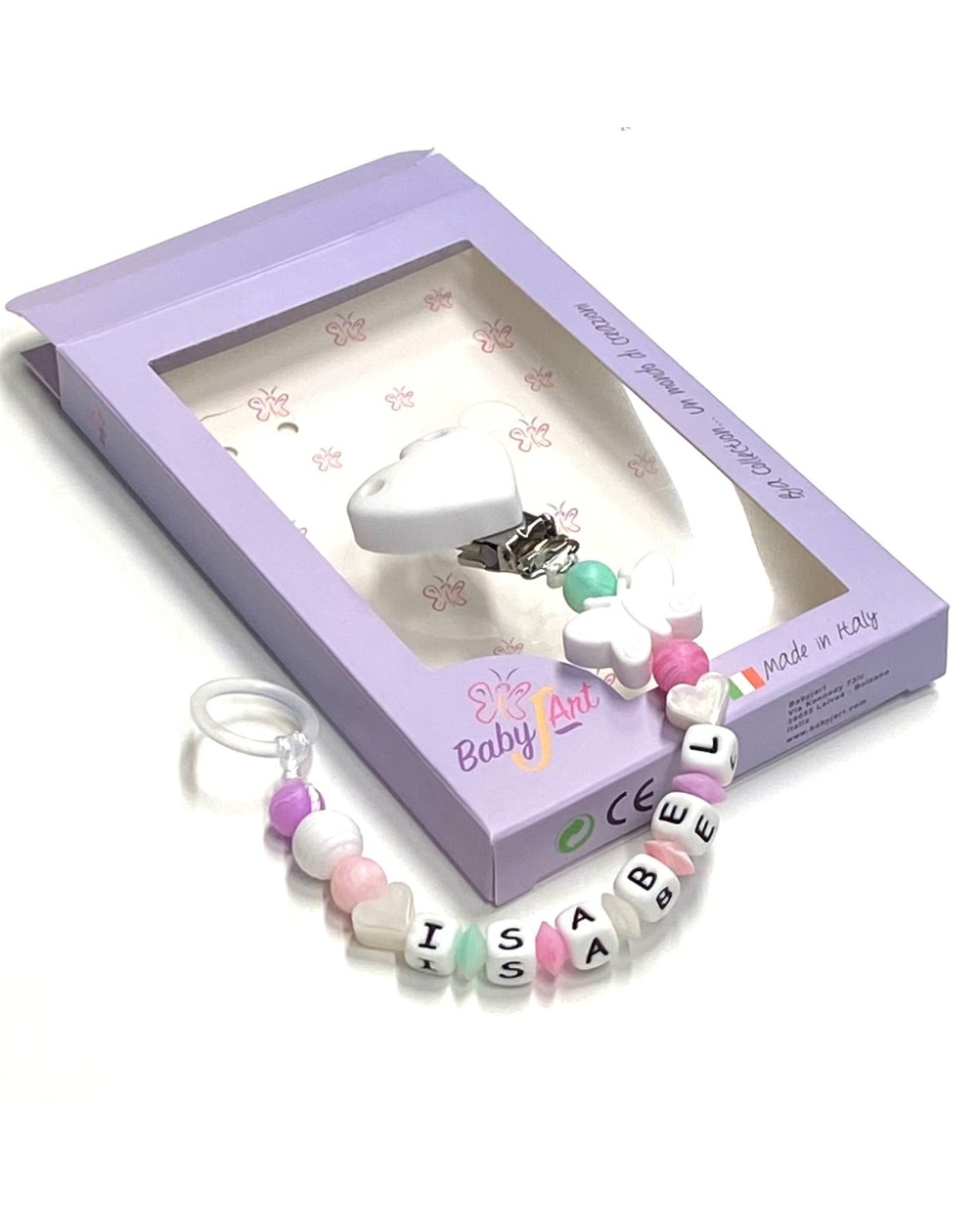 Alle Komponenten werden nach höchsten Sicherheitsstandards und gemäß EN 71-3 hergestellt: - Die verwendete Farbart ist völlig ungiftig, unlösbar, resistent gegen Speichel und Schweiß und frei von BPA - Metallteile sind rostfrei und nickelfrei Aus Sicherheitsgründen erreicht die Kette von einem Knoten und einem Knoten eine Länge zwischen maximal 20/22 cm. Es wird dann an die Länge des Namens angepasst, ohne jedoch Änderungen am Typ vorzunehmen. Die Kette ist daher für jede Art von Schnuller geeignet.