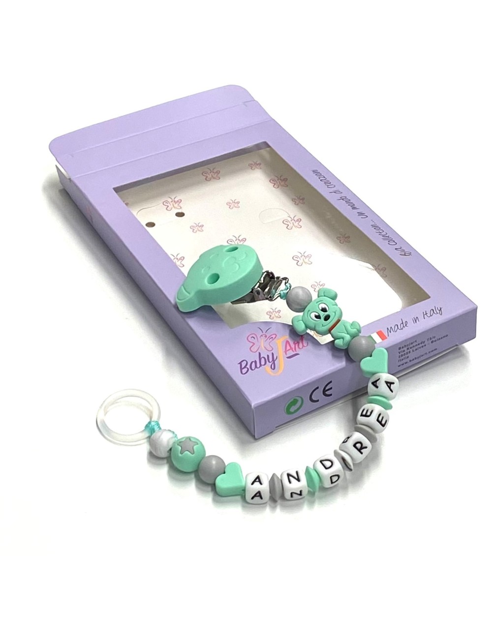 Alle Komponenten werden nach höchsten Sicherheitsstandards und gemäß EN 71-3 hergestellt: - Die verwendete Farbart ist völlig ungiftig, unlösbar, resistent gegen Speichel und Schweiß und frei von BPA - Metallteile sind rostfrei und nickelfrei Aus Sicherheitsgründen erreicht die Kette von einem Knoten und einem Knoten eine Länge zwischen maximal 20/22 cm. Es wird dann an die Länge des Namens angepasst, ohne jedoch Änderungen am Typ vorzunehmen. Die Kette ist daher für jede Art von Schnuller geeignet.