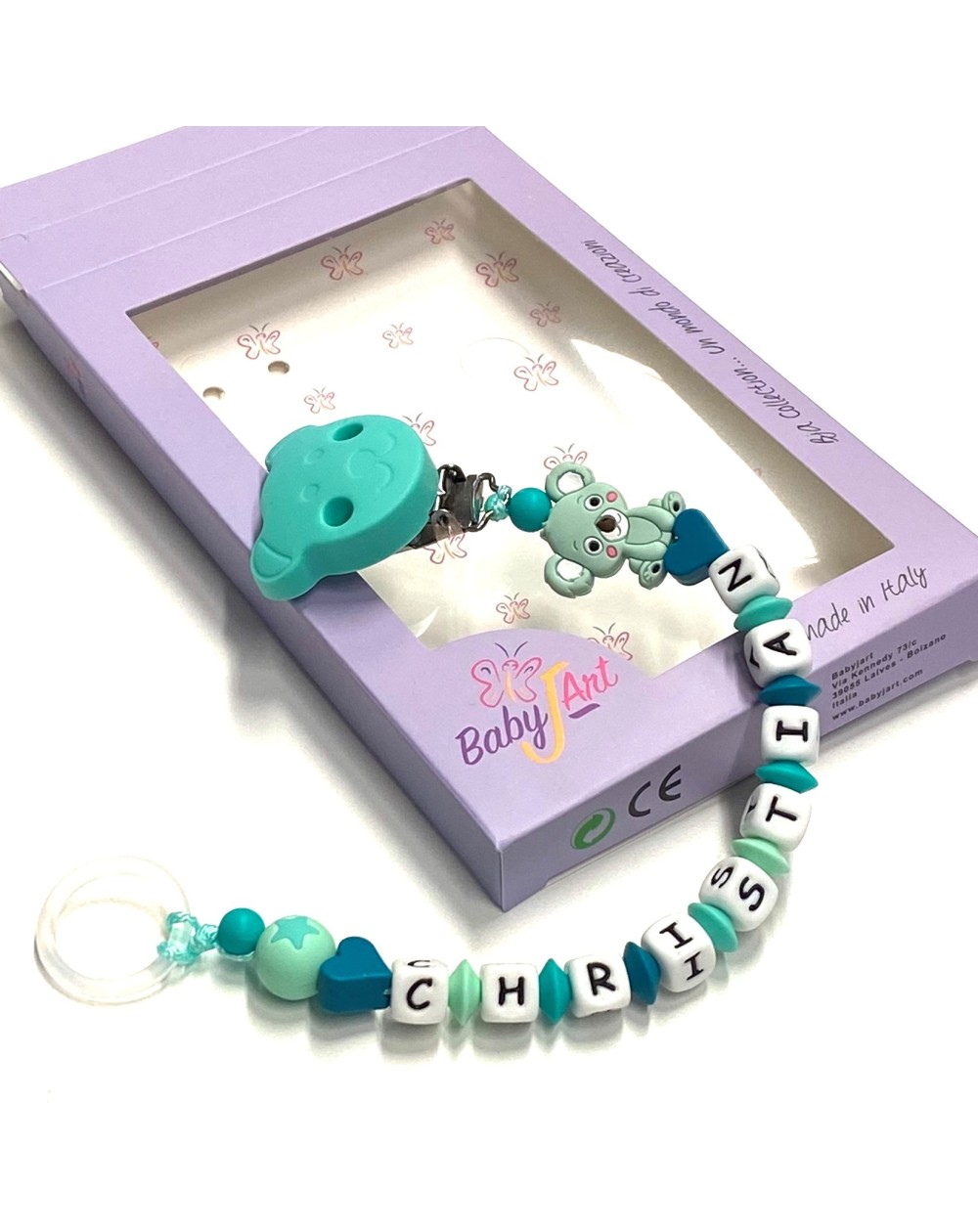 Alle Komponenten werden nach höchsten Sicherheitsstandards und gemäß EN 71-3 hergestellt: - Die verwendete Farbart ist völlig ungiftig, unlösbar, resistent gegen Speichel und Schweiß und frei von BPA - Metallteile sind rostfrei und nickelfrei Aus Sicherheitsgründen erreicht die Kette von einem Knoten und einem Knoten eine Länge zwischen maximal 20/22 cm. Es wird dann an die Länge des Namens angepasst, ohne jedoch Änderungen am Typ vorzunehmen. Die Kette ist daher für jede Art von Schnuller geeignet.