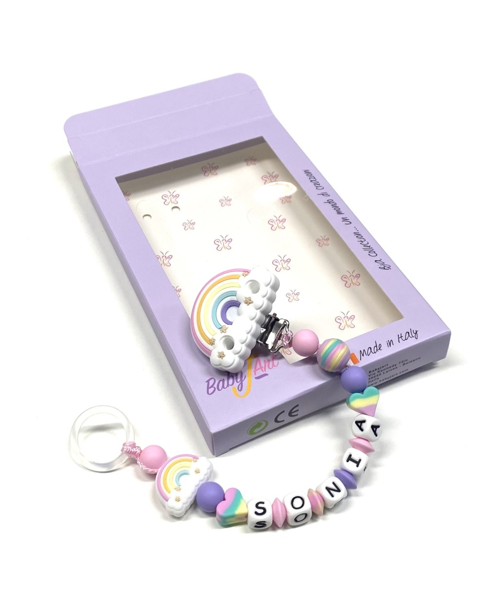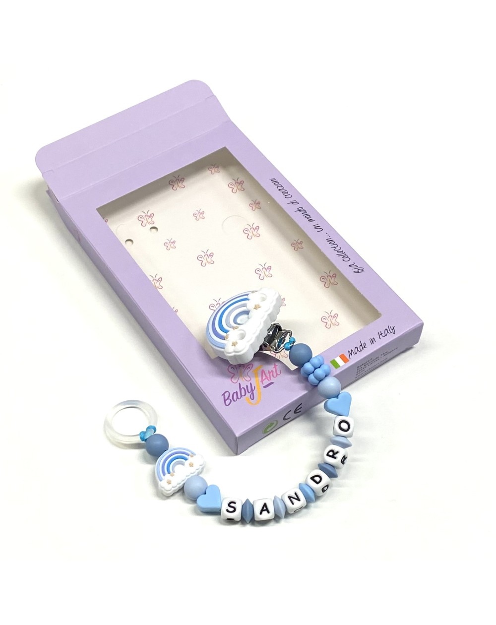 Alle Komponenten werden nach höchsten Sicherheitsstandards und gemäß EN 71-3 hergestellt: - Die verwendete Farbart ist völlig ungiftig, unlösbar, resistent gegen Speichel und Schweiß und frei von BPA - Metallteile sind rostfrei und nickelfrei Aus Sicherheitsgründen erreicht die Kette von einem Knoten und einem Knoten eine Länge zwischen maximal 20/22 cm. Es wird dann an die Länge des Namens angepasst, ohne jedoch Änderungen am Typ vorzunehmen. Die Kette ist daher für jede Art von Schnuller geeignet.
