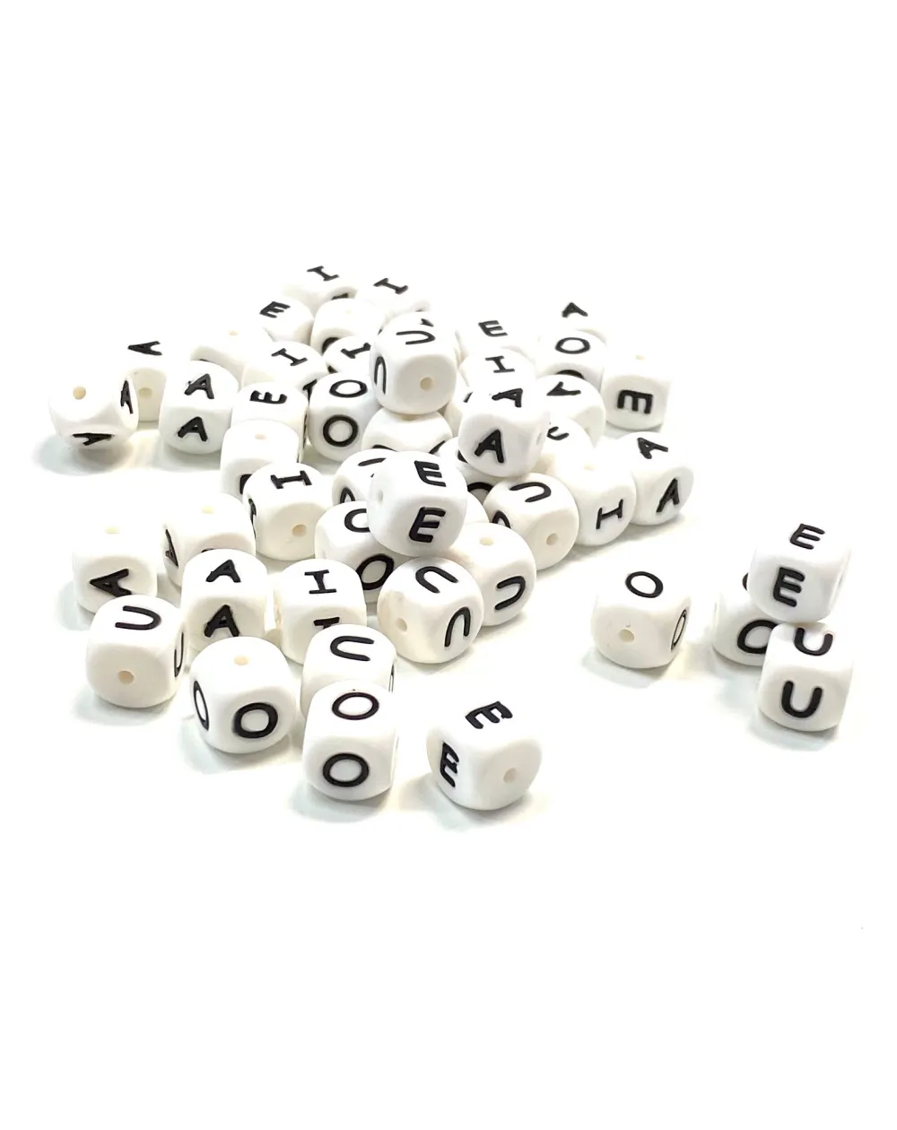 Silikonbuchstabenwürfel, Vokale. Große 12mm. Loch ca. 3mm horizontal (von rechts nach links)