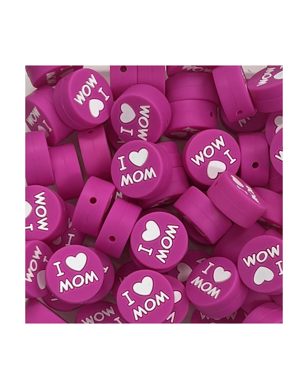 I LOVE MOM aus Silikon. Durchmesser ca. 20mmx10mm - Loch ca. 3 mm vertikal (von oben nach unten)