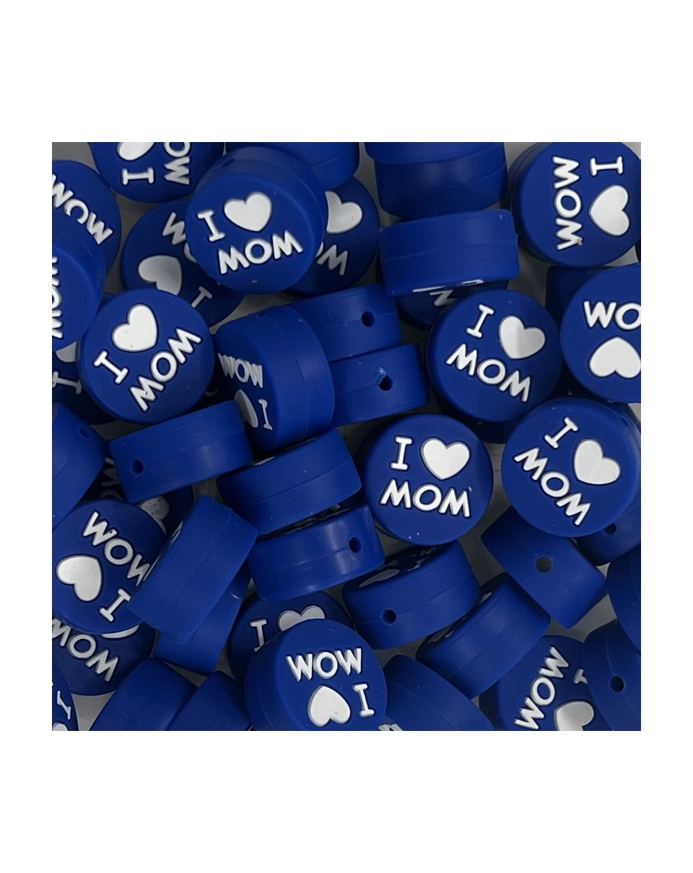 I LOVE MOM aus Silikon. Durchmesser ca. 20mmx10mm - Loch ca. 3 mm vertikal (von oben nach unten)