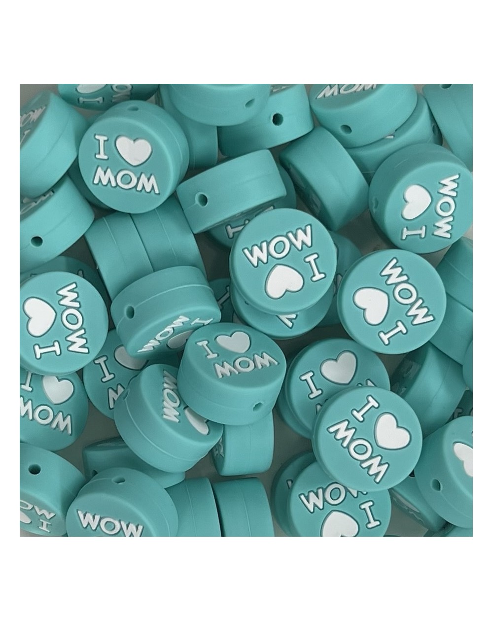 I LOVE MOM aus Silikon. Durchmesser ca. 20mmx10mm - Loch ca. 3 mm vertikal (von oben nach unten)