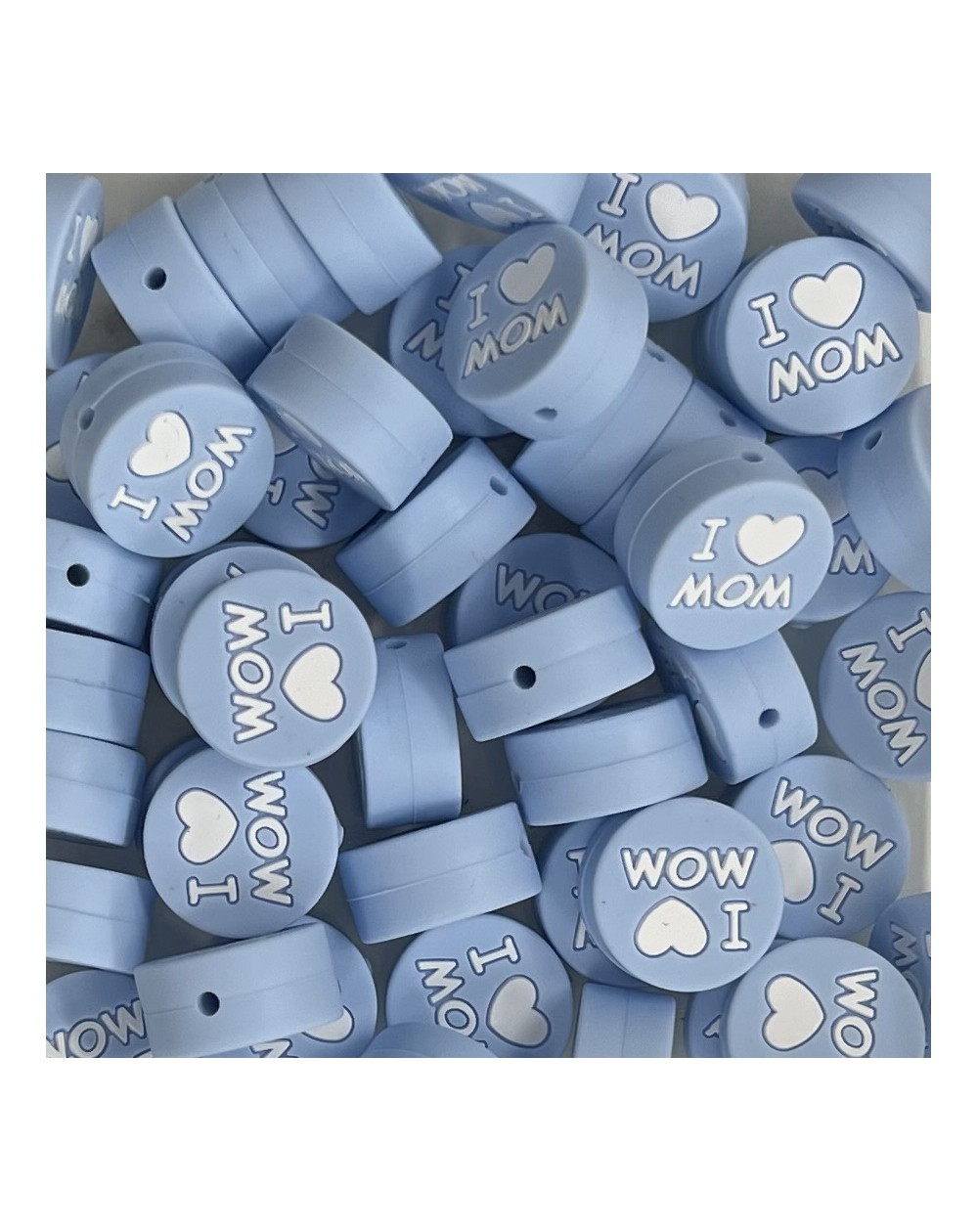 I LOVE MOM aus Silikon. Durchmesser ca. 20mmx10mm - Loch ca. 3 mm vertikal (von oben nach unten)
