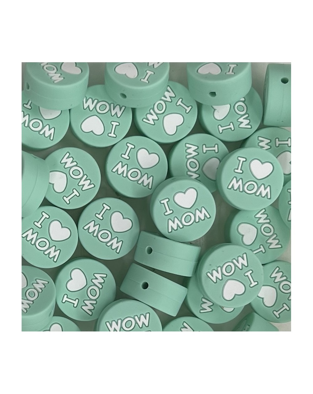 I LOVE MOM aus Silikon. Durchmesser ca. 20mmx10mm - Loch ca. 3 mm vertikal (von oben nach unten)