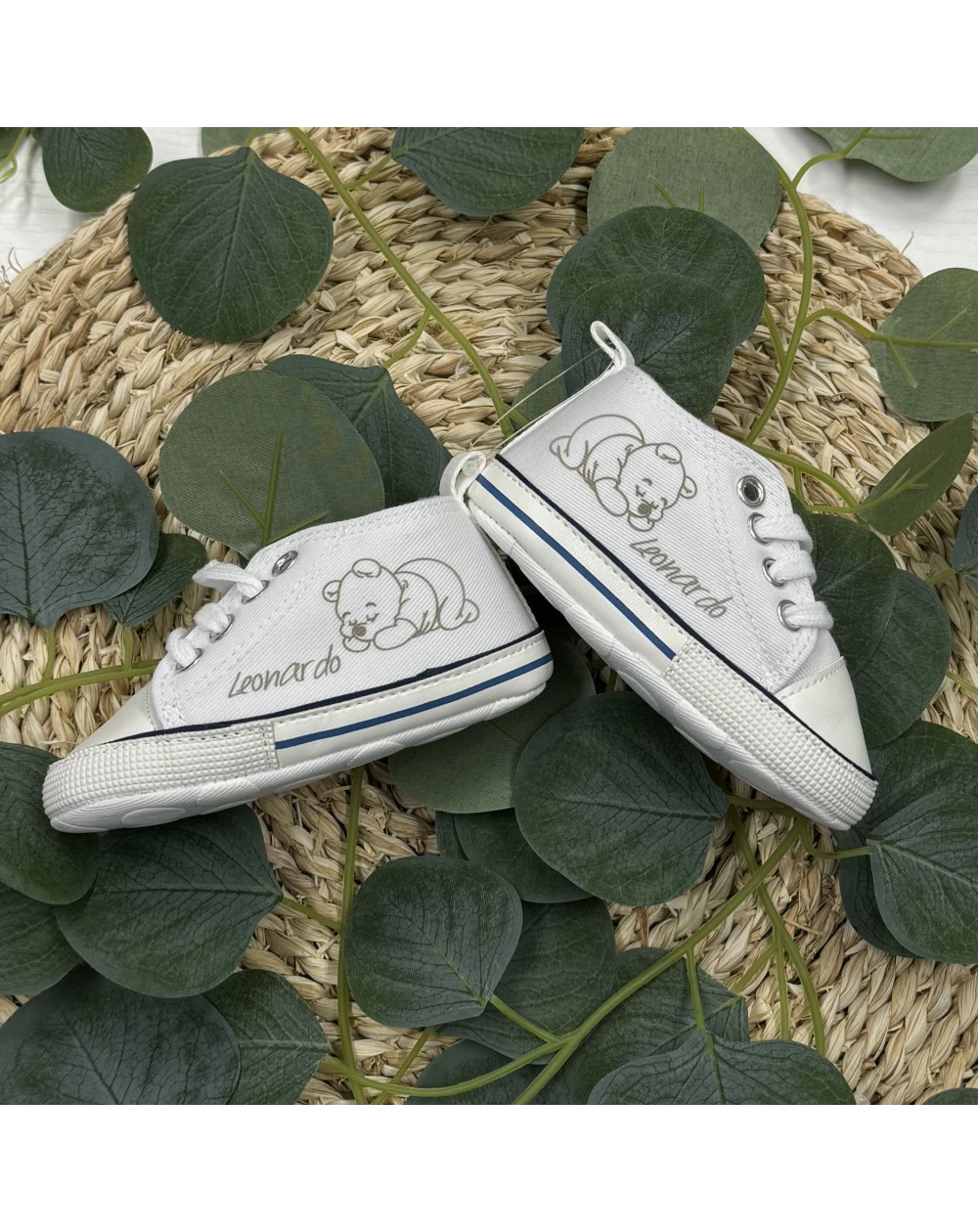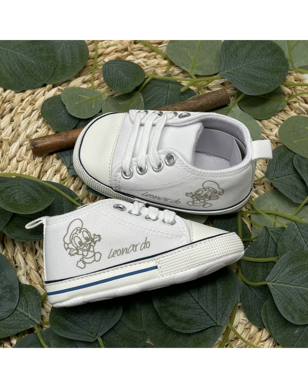 These first adorable baby sneakers are made of canvas, with laces, an eco-leather toe, and a fabric sole.