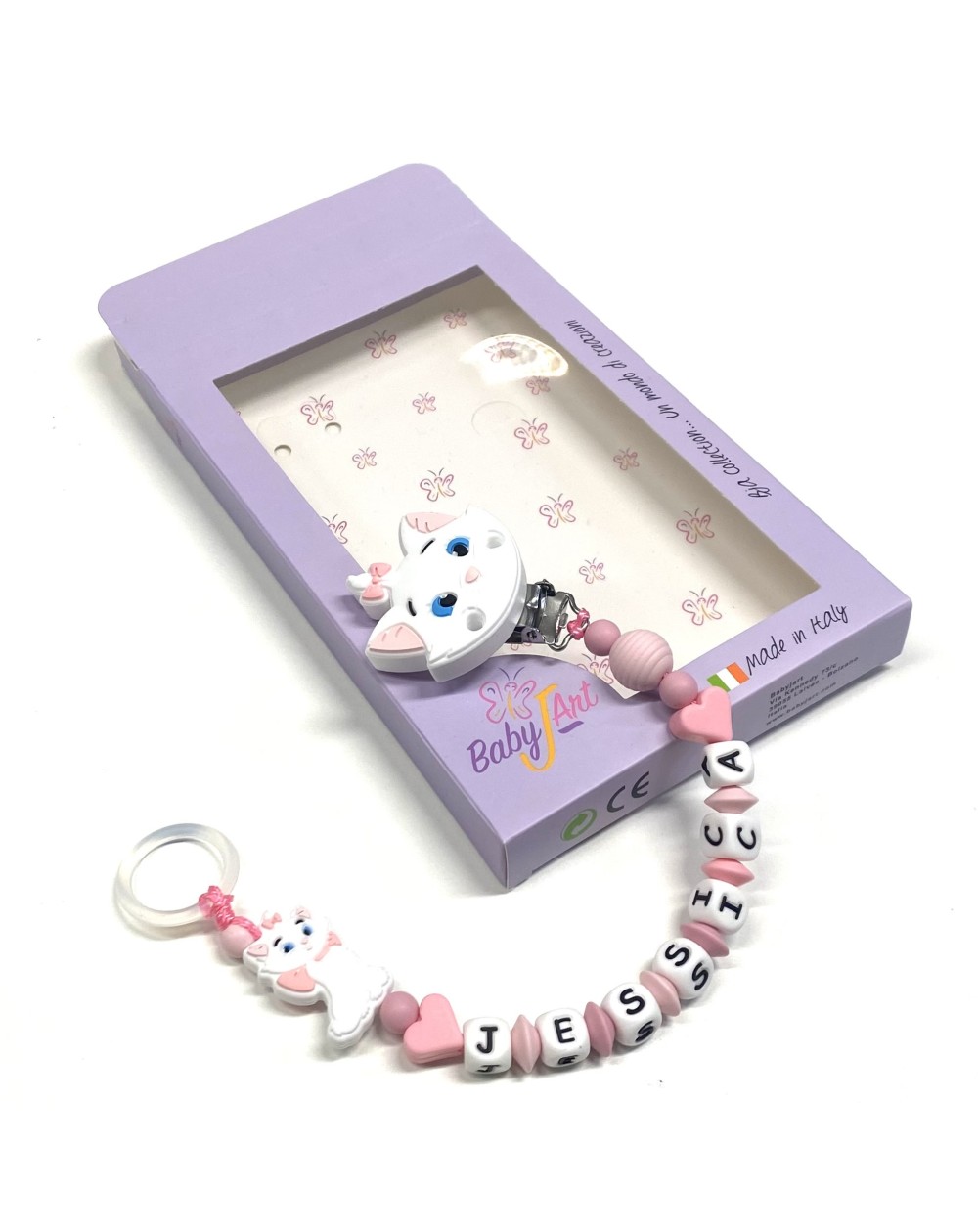 Babyjart silicone dummy chain PRESTIGE MINOU with name, hook / adapter pacifier MAM and CHICCO