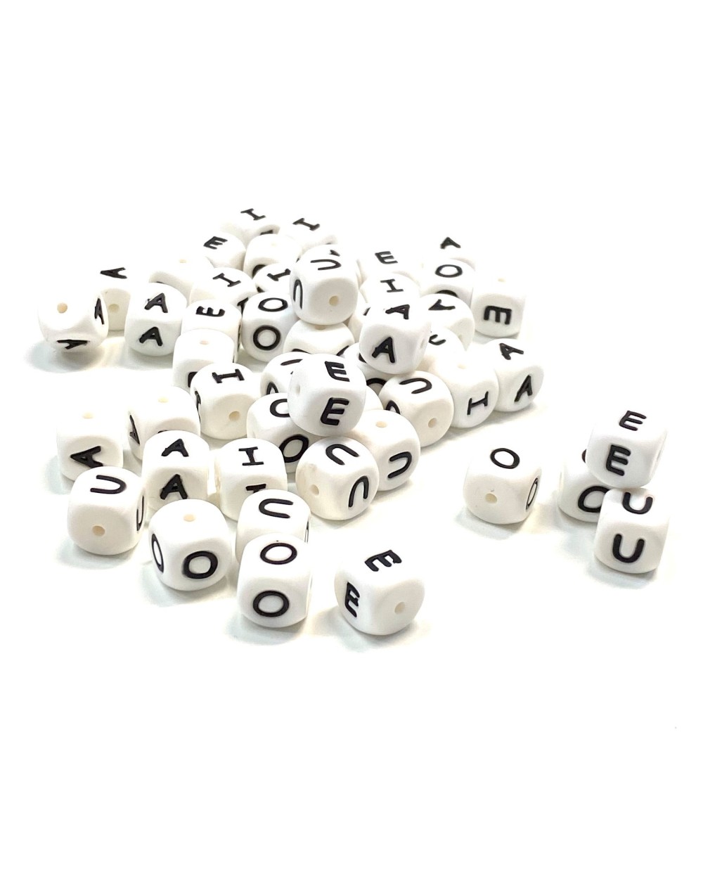 Alphabet Vowels letters in silicone. Size 12mm. Hole approx. 3mm horizontal (from right to left)