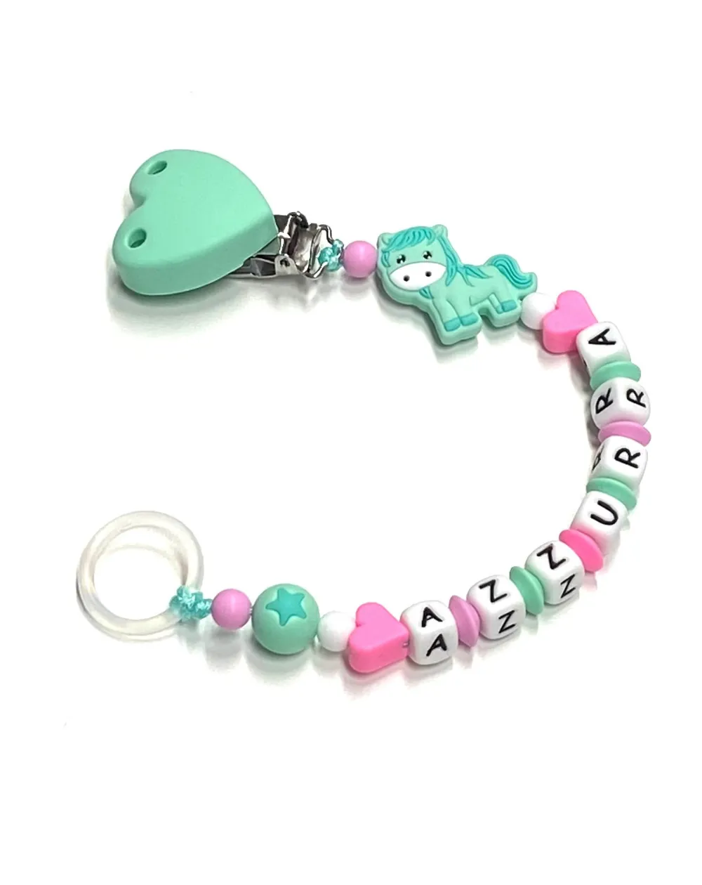 Silicone chain holder, made strictly by hand in compliance with EN 71-3. Customizable with name. Name max 10 letters; Double name max 9 letters. Choice of the CLIP and FIGURE variants