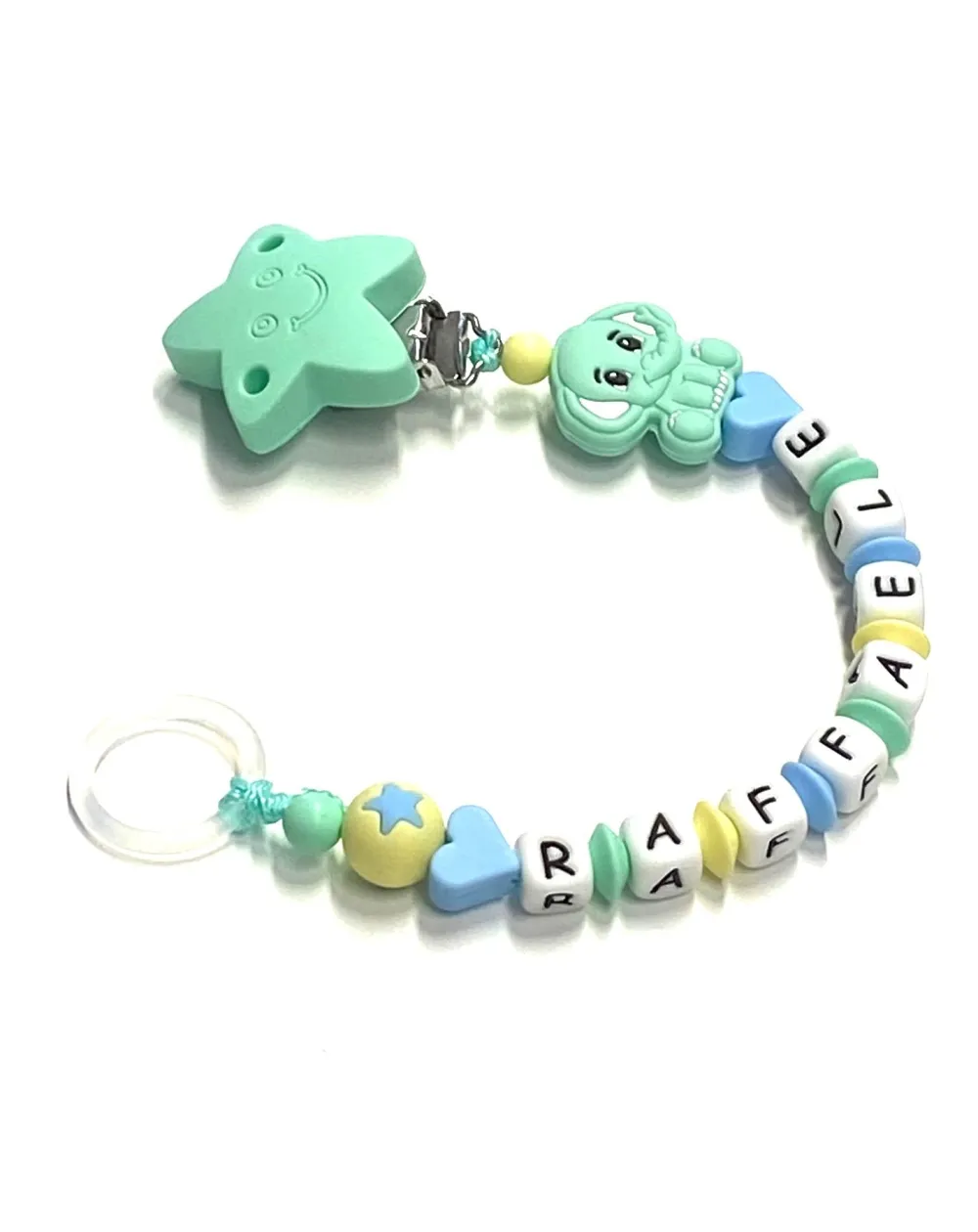 Silicone chain holder, made strictly by hand in compliance with EN 71-3. Customizable with name. Name max 10 letters; Double name max 9 letters. Choice of the CLIP and FIGURE variants