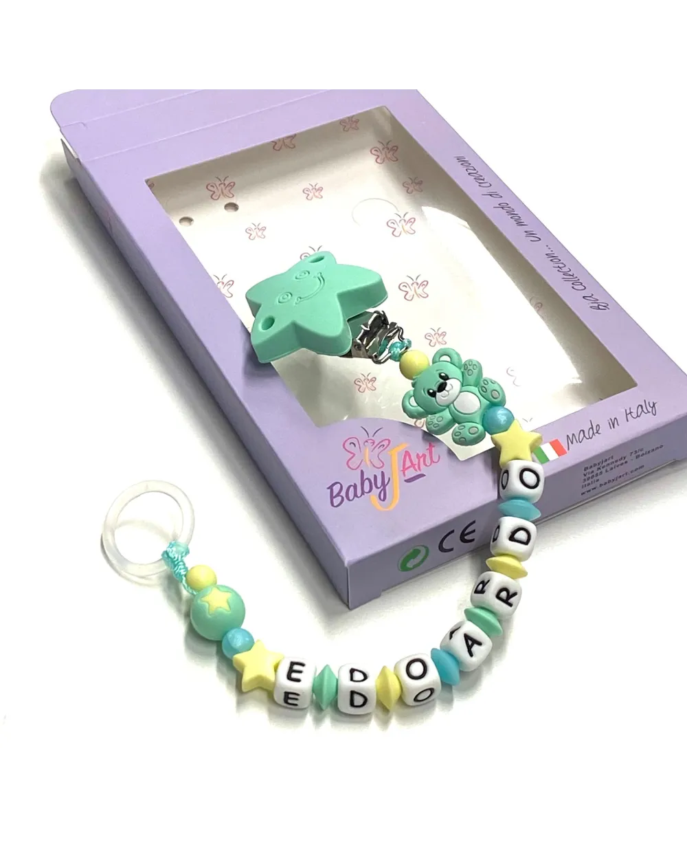 Silicone chain holder, made strictly by hand in compliance with EN 71-3. Customizable with name. Name max 10 letters; Double name max 9 letters. Choice of the CLIP and FIGURE variants