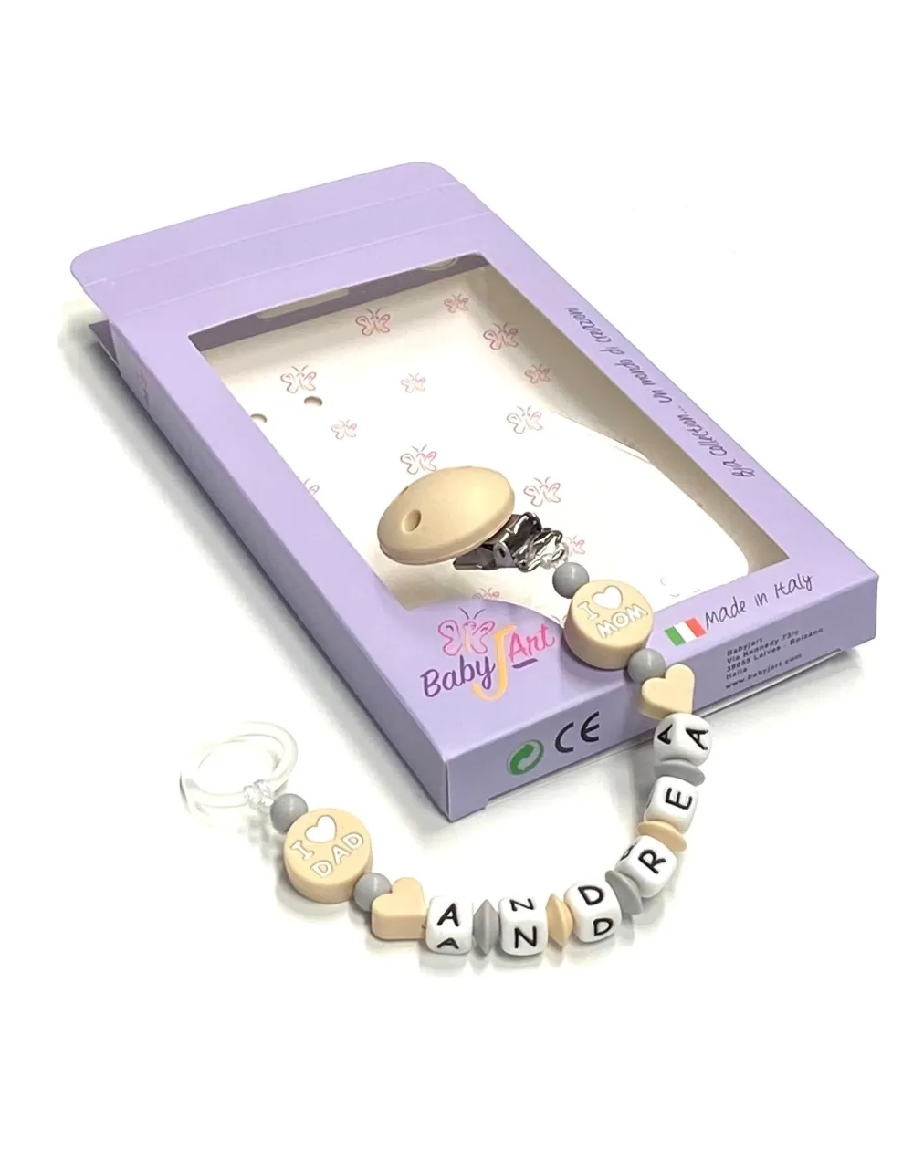 Babyjart Cadena de silicona para chupete con nombre, gancho / adaptador para chupete mam y modelo de chicco