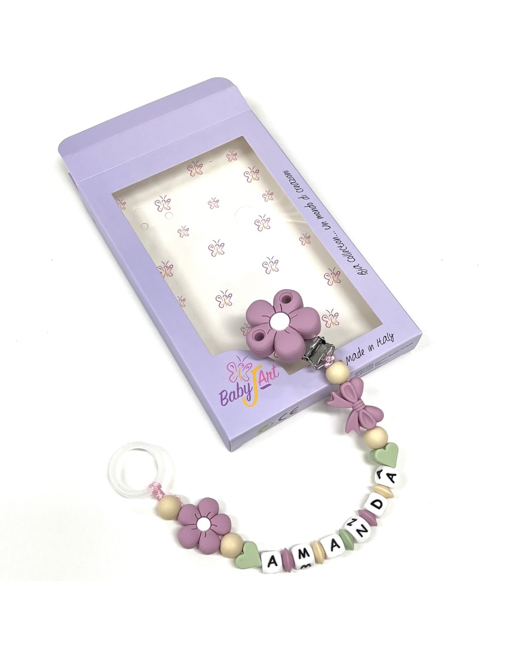 Haz que cada momento sea especial con la cadena para chupete Babyjart personalizada, hecha a mano en silicona alimentaria de alta calidad y grabada con el nombre del bebé.