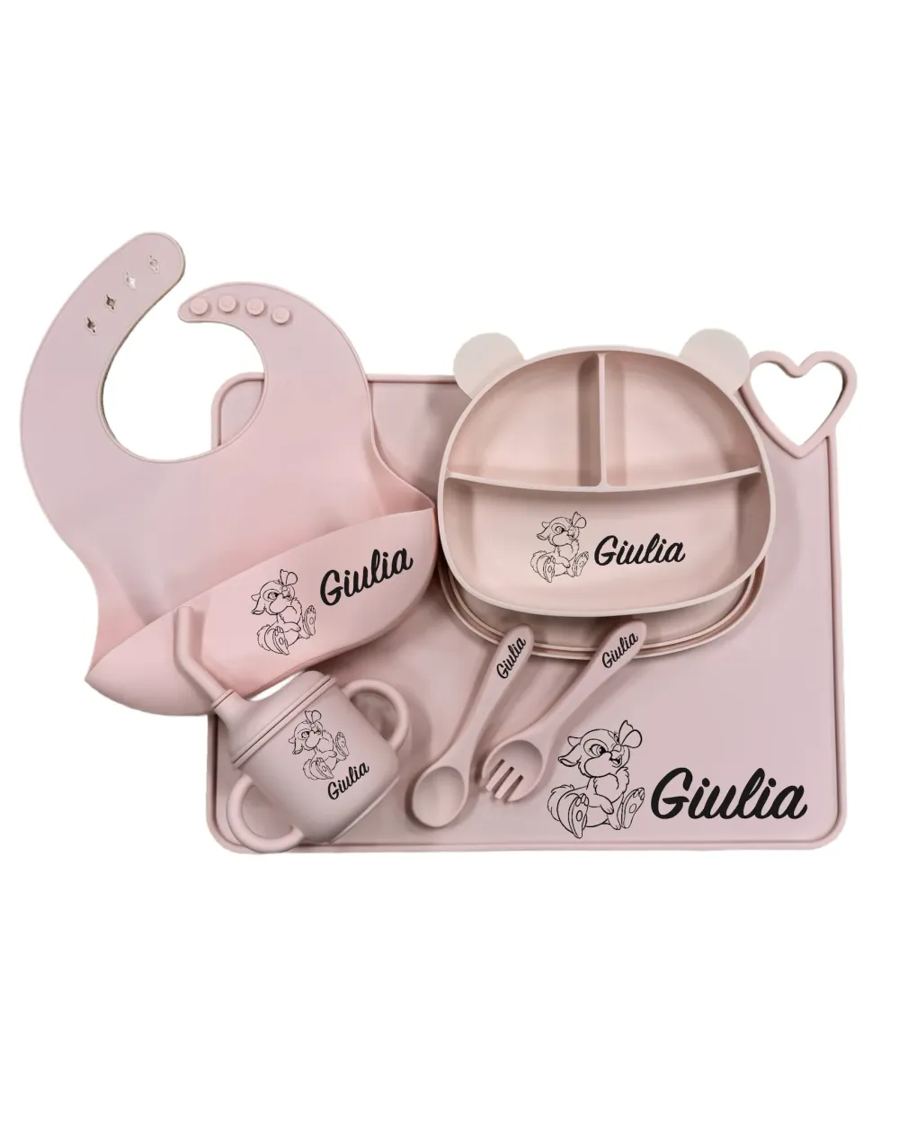 El set de alimentación de silicona personalizado con nombre incluye todo lo necesario para las comidas del bebé: un mantel individual con agujero en forma de corazón (también útil para colgarlo), un babero con bolsillo recoge-comida, una taza con asas, tapa y pajita, un plato con tapa, además de cuchara y tenedor de silicona. Seguro, antideslizante, resistente y fácil de limpiar: el kit ideal para la primera comida y el destete.