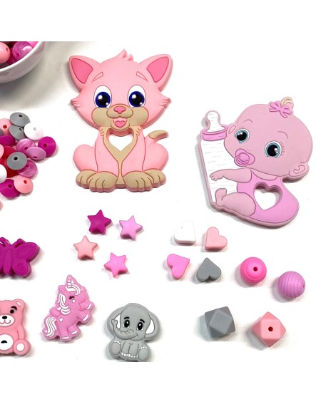 03A KIT STARTER ROSE Prix 32,00 € CONTENU DU KIT : 30 PERLES 12MM 30 LENTILLES CORDON 5M 5 CLIP 2 HEXAGONAUX...