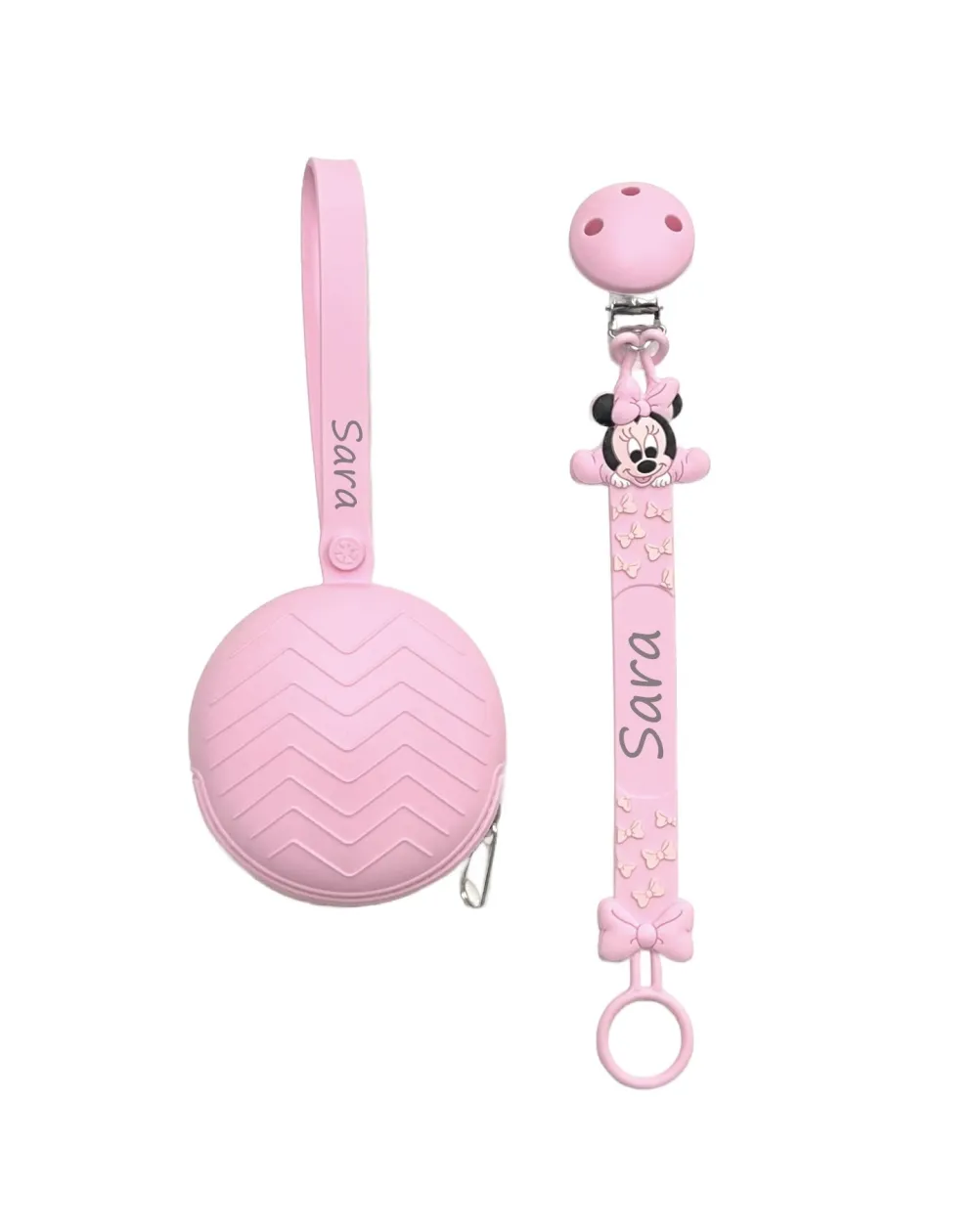 Attache-tétine personnalisée en silicone FLAT – Porte-tétine avec prénom - Minnie - Rose clair