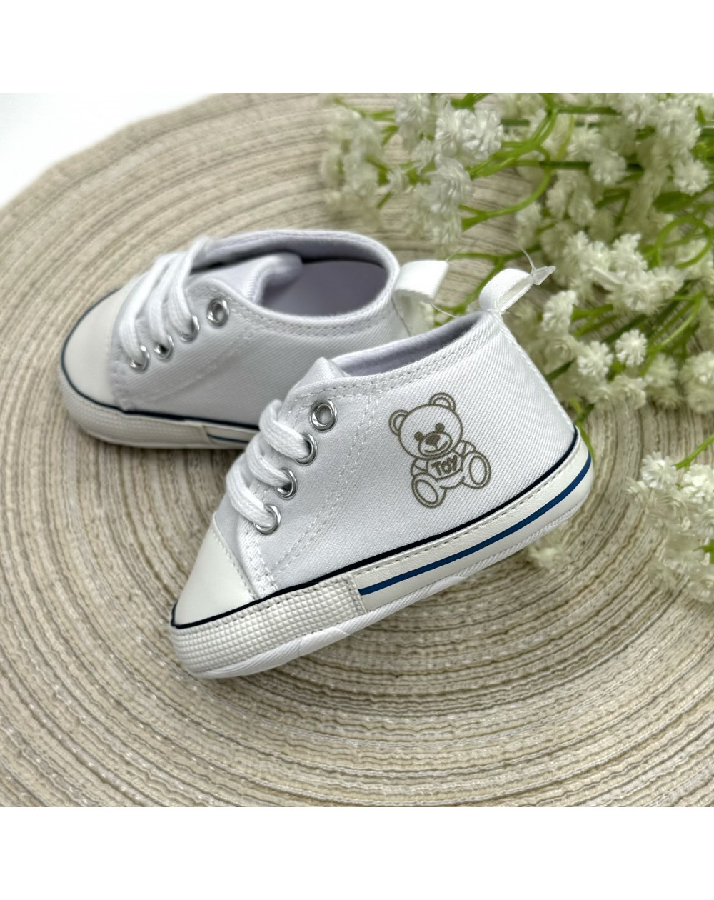 Les premières belles baskets pour bébé sont en toile, avec lacets, bout en cuir écologique et semelle en tissu.