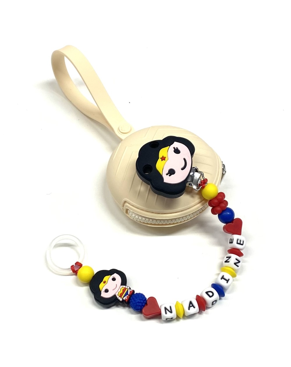 Attache-Sucette Personnalisée, WONDERWOMAN, Sucette avec Prénom, Chaîne Tétine en Silicone, Porte-Tétine Personnalisé