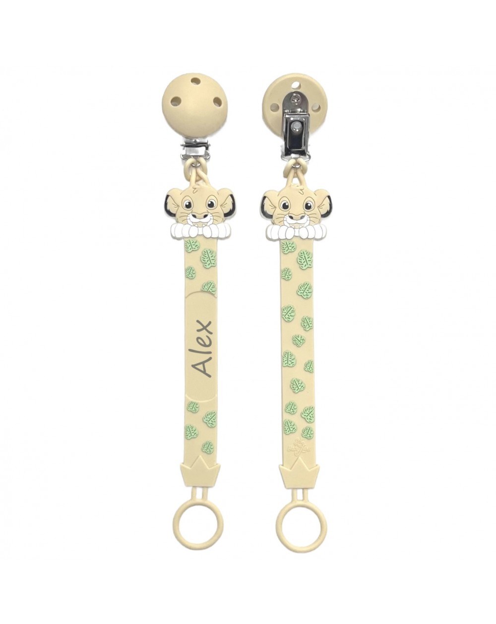 Catenella portaciuccio FLAT LEONE BEIGE in silicone con nome, gancio/adattatore ciuccio MAM e CHICCO