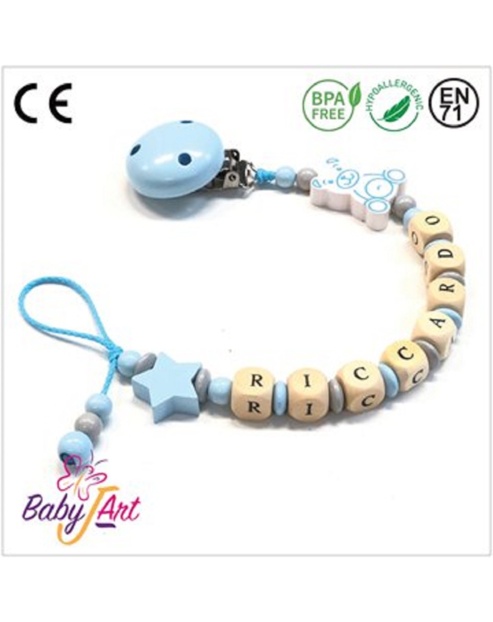 Babyjart Catenella portaciuccio legno con nome, gancio/adattatore ciuccio mam