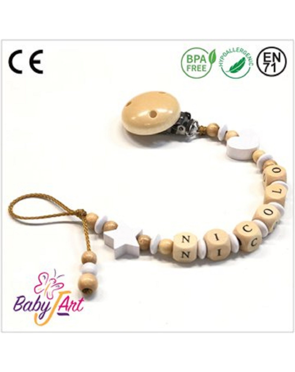 Babyjart Catenella portaciuccio legno con nome, gancio/adattatore ciuccio mam