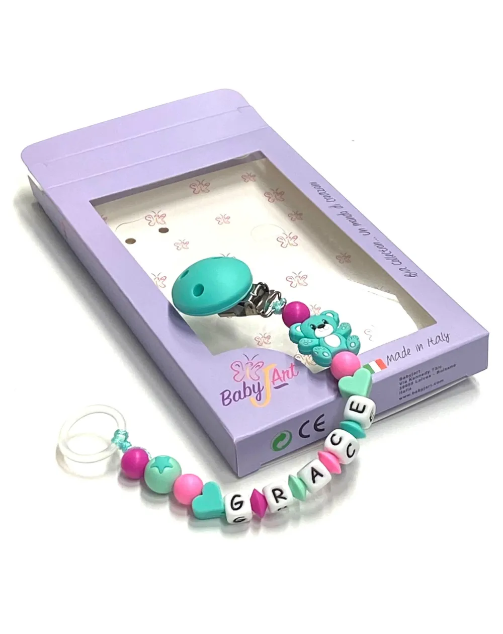 Babyjart Catenella portaciuccio silicone con nome, gancio/adattatore ciuccio MAM e CHICCO