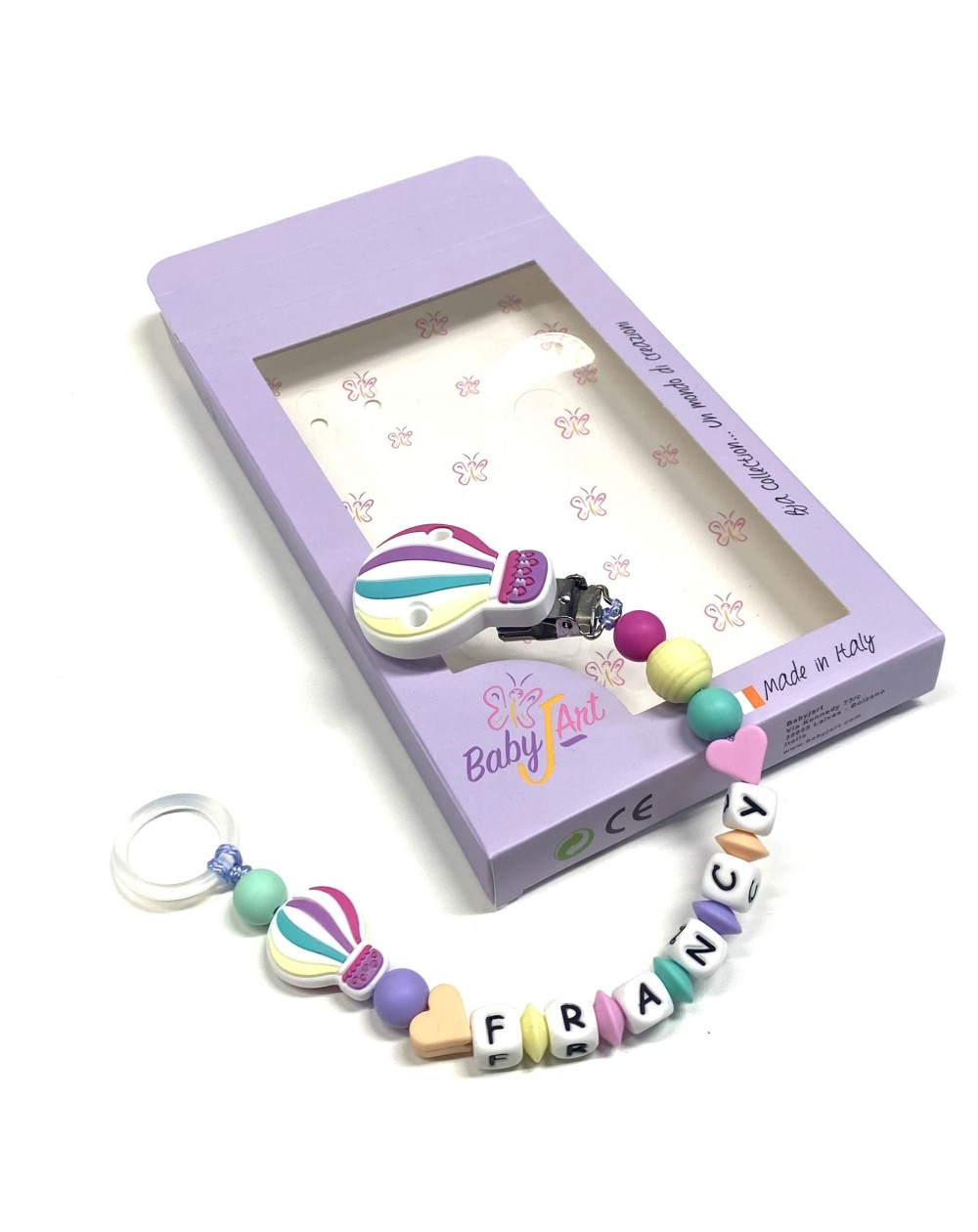 Catenella Portaciuccio personalizzata, MONGOLFIERA, Portaciuccio con Nome, Catenina in Silicone, Porta Ciuccio Personalizzato