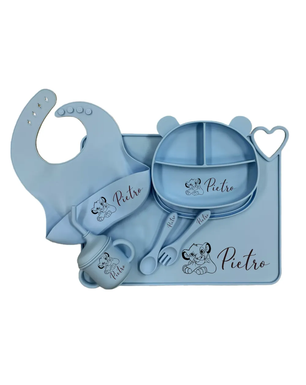 Il Set Pappa in Silicone Personalizzato con Nome è composto da tutto il necessario per la pappa dei più piccoli: tovaglietta con foro a cuore (utile anche per appenderla), bavaglino con tasca raccogli-cibo, tazza con manici e coperchio con cannuccia, piatto con coperchio, cucchiaino e forchetta in silicone alimentare. Sicuro, antiscivolo, resistente e facile da pulire: il kit ideale per la prima pappa e lo svezzamento.