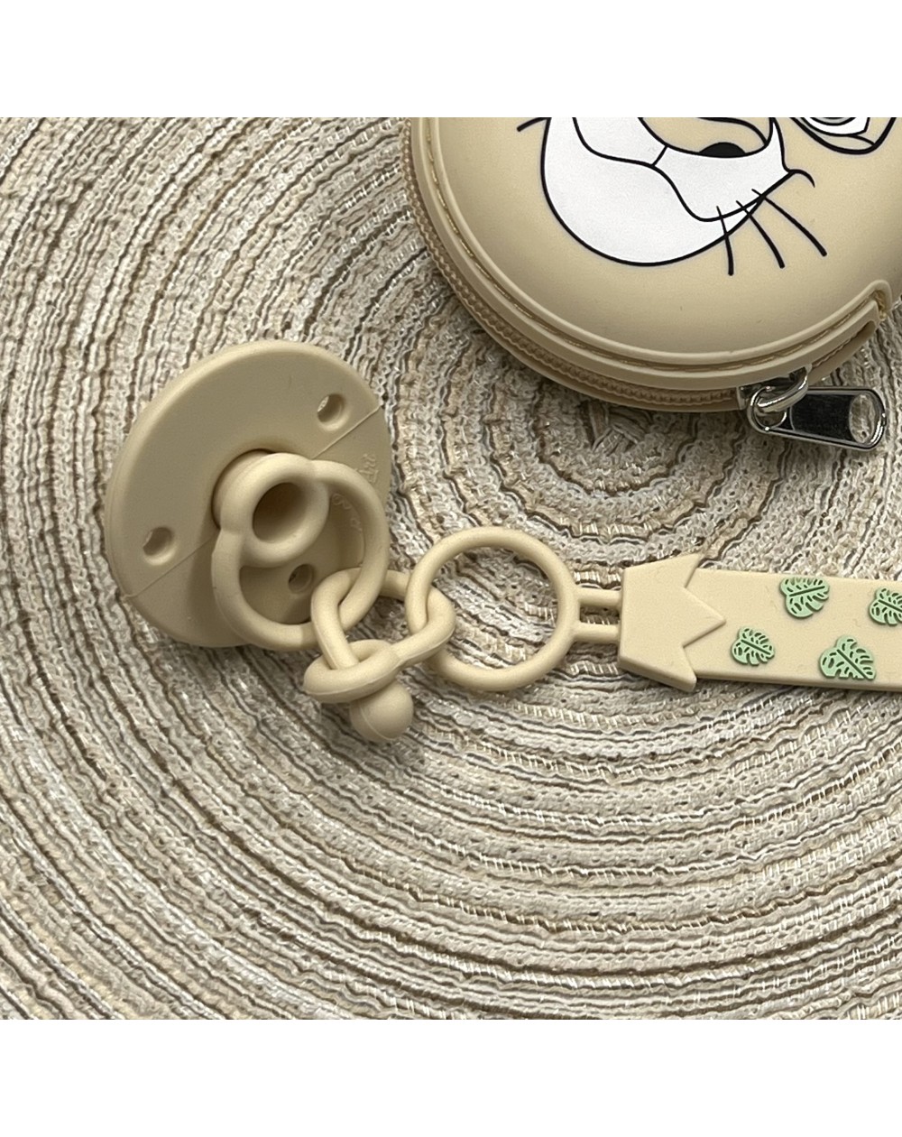 Cadeia de chupeta FLAT LEÃO BEIGE de silicone com nome, adaptador / gancho de chupeta MAM e modelo CHICCO