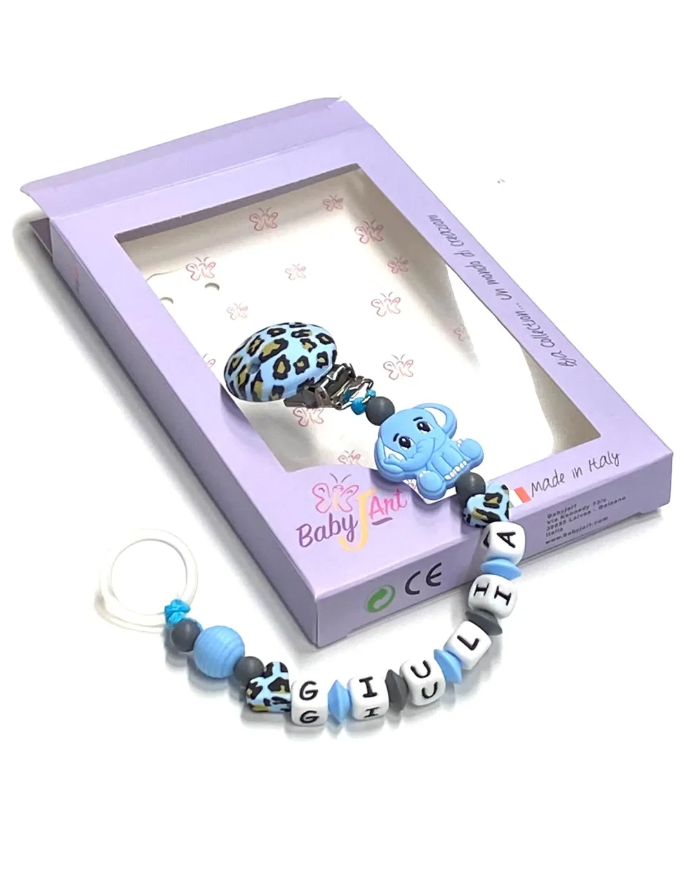 Cadeia de chupeta de silicone, fabricada estritamente à mão em conformidade com a EN 71-3.