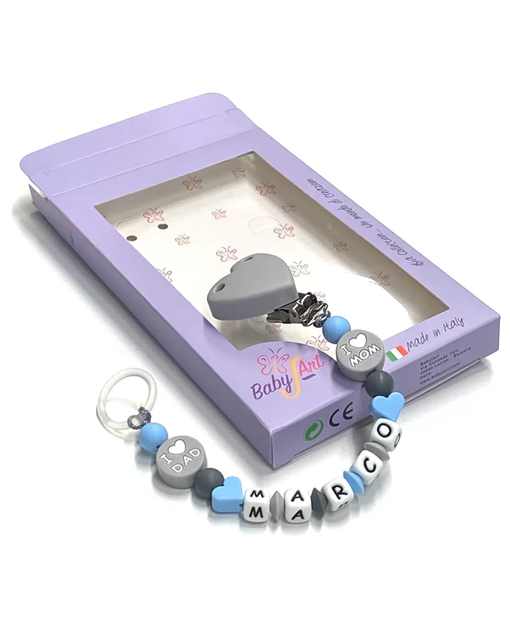 Babyjart Cadeia de chupeta de silicone com nome, adaptador / gancho de chupeta MAM e modelo CHICCO