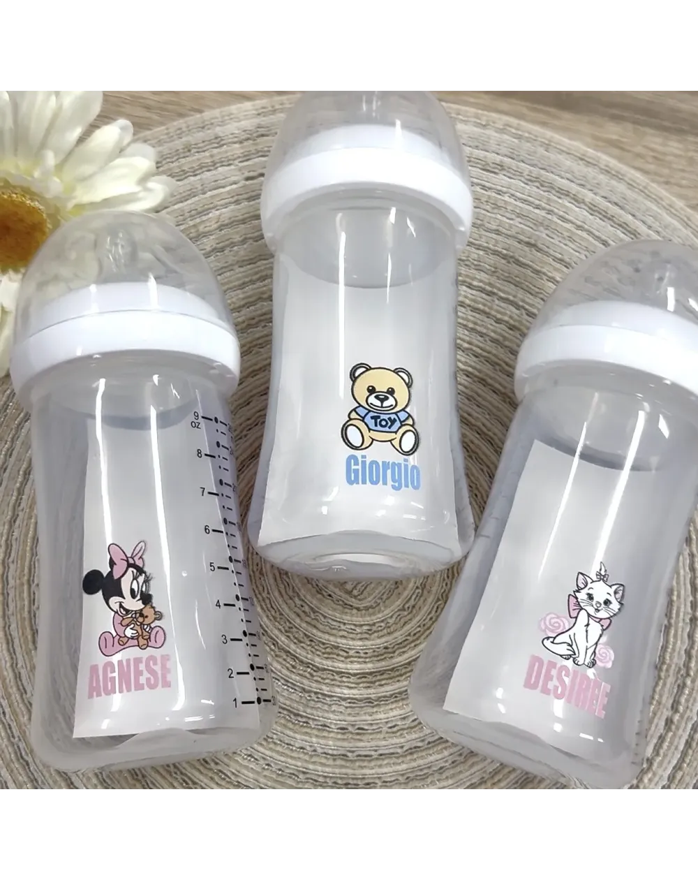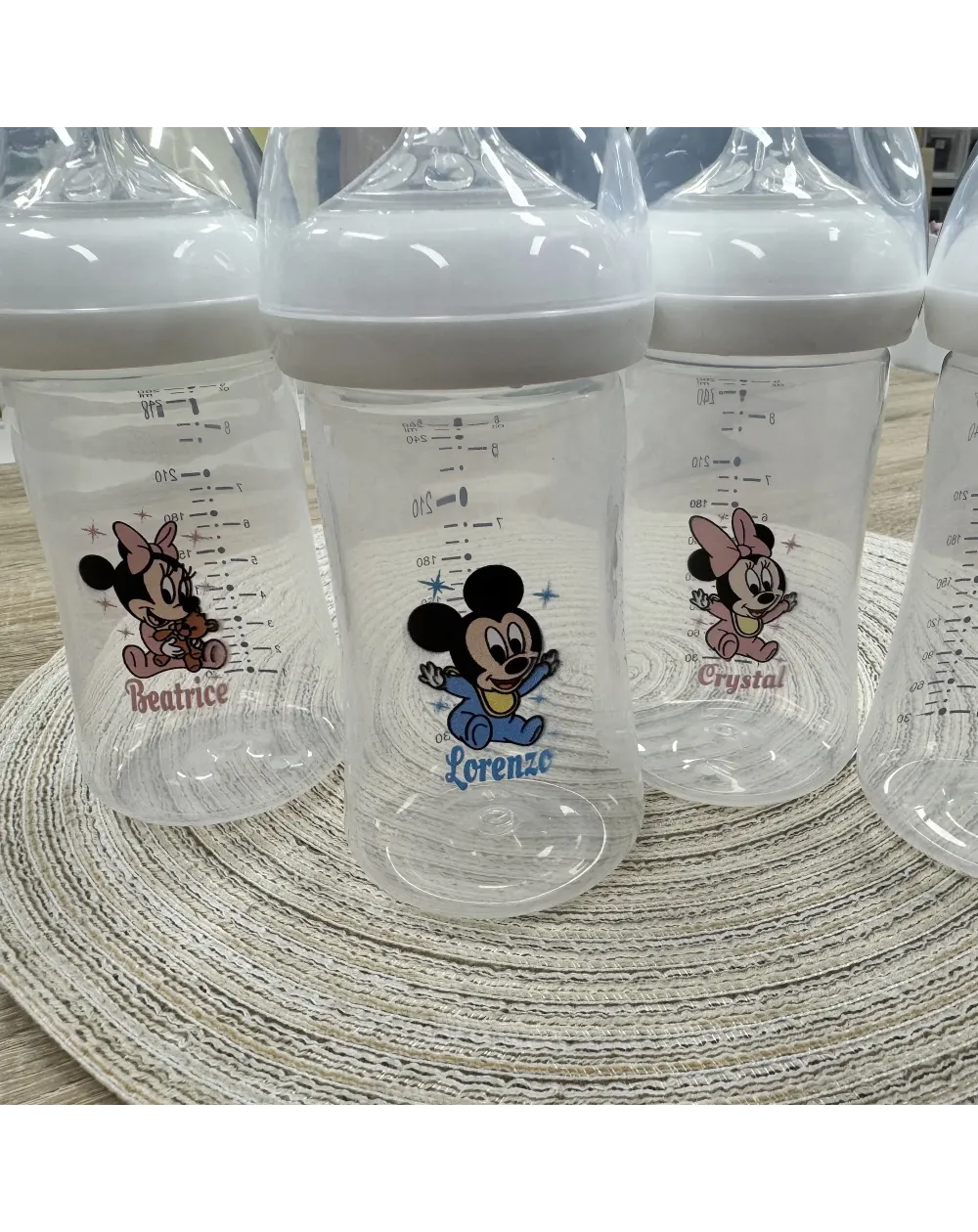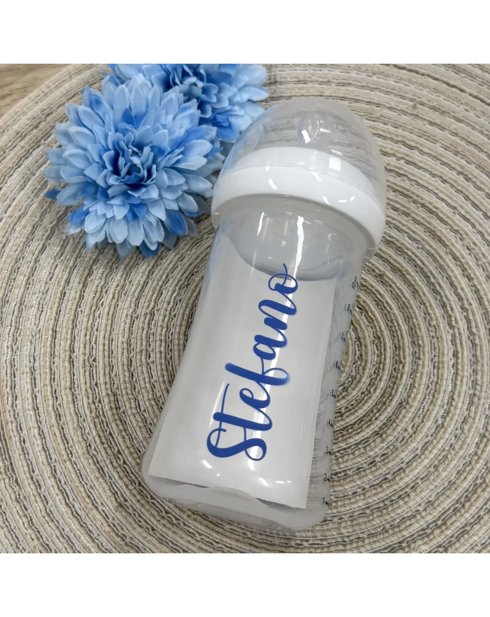 Cada biberão é feito à medida, com uma gravação precisa e duradoura do nome do bebé.