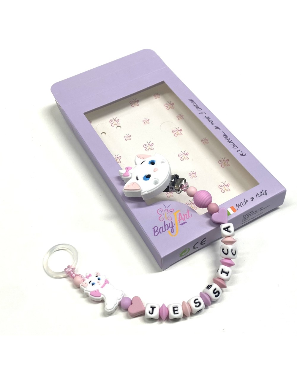 Babyjart Cadeia de chupeta PRESTIGE MINOU de silicone com nome, adaptador / gancho de chupeta MAM e modelo CHICCO