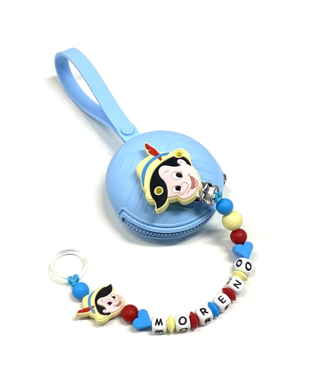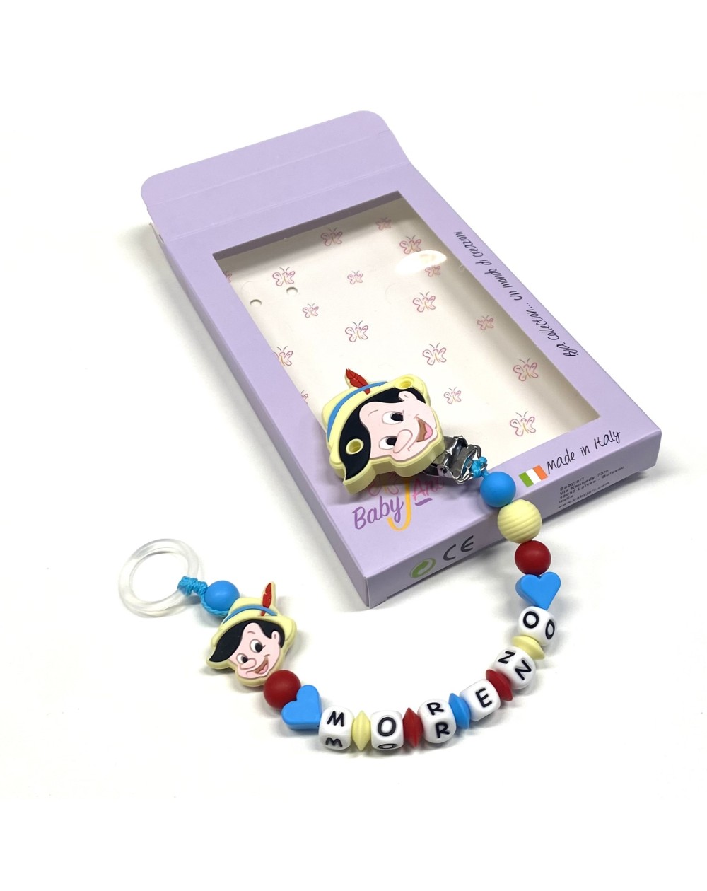 Babyjart Cadeia de chupeta PRESTIGE PINOCCHIO de silicone com nome, adaptador / gancho de chupeta MAM e modelo CHICCO