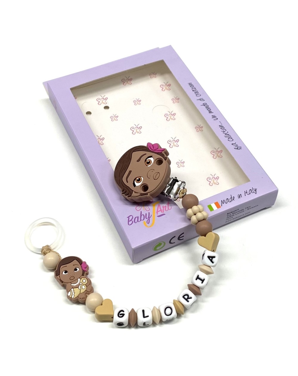 Cadeia de chupeta de silicone, fabricada estritamente à mão em conformidade com a EN 71-3.